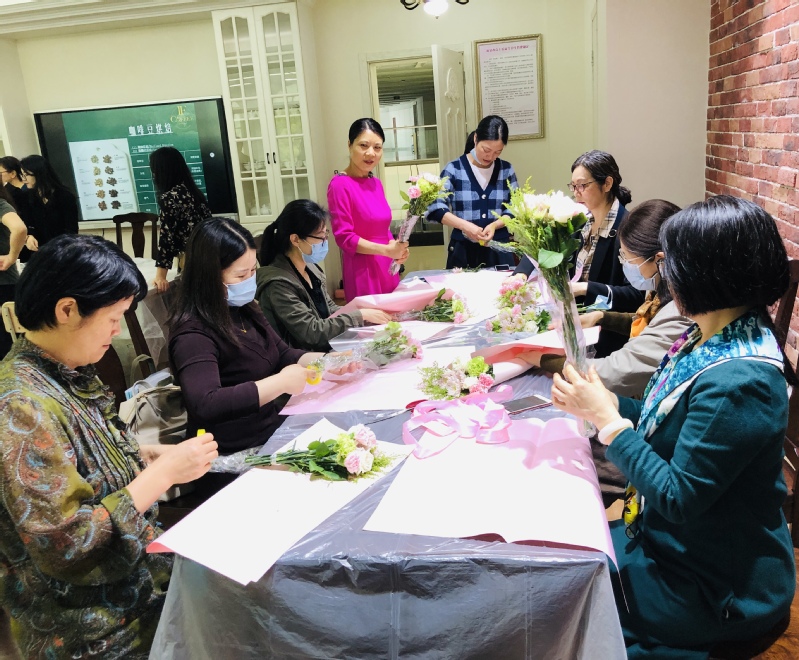 在春花烂漫的五月,为丰富女教工的业余生活,提升女教工艺术素养,增强团队凝聚力。5月11日下午,银领学院在金葵花艺术中心三楼烘焙教室开展了女教工艺术插花与咖啡品鉴活动。