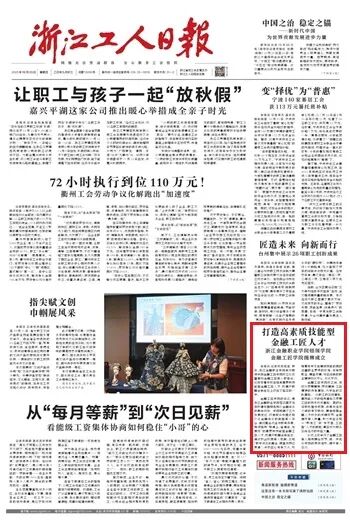 10月23日,《浙江工人日报》专版刊发我院人才培养文章《打造高素质技能型金融工匠人才》。