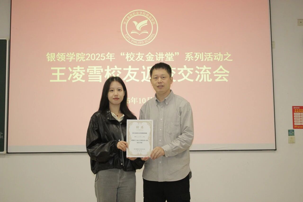 金忠浩对王凌雪校友的到来表示热烈欢迎,并为其颁发《银领学子成才青蓝结对工程职业导师》聘书。